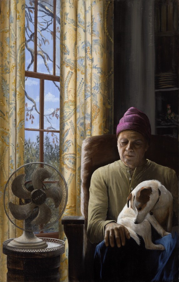 In this painting my dog and I have just noticed, maybe for the first time, that my hand is old. As in, my hand got old, but I didn't. Best if both of us log that little fact away, lean back, and enjoy the beautiful day streaming in through the window.