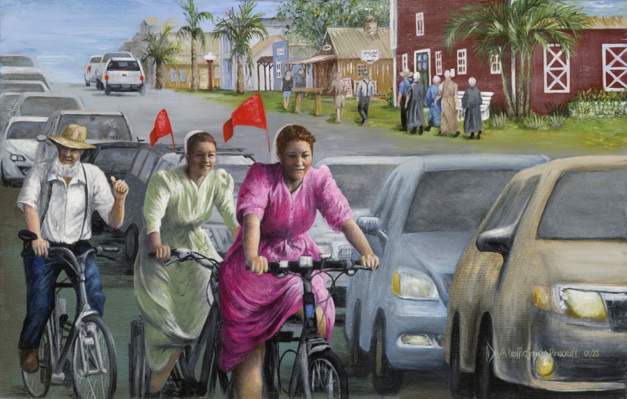 A Traffic Jam in Pinecraft, oil on canvas on ACP, 14 by 22 inches, completed January 2023.