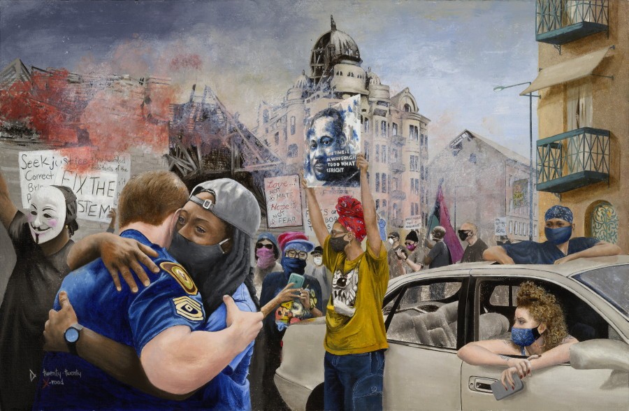 Crossroad is primarily about a hug between a police officer and a protester. It is also about choices and the consequences of those choices. It is about people, communication, fear, and the new normal. It is the most chaotic piece that I have completed, but that's kinda the point.