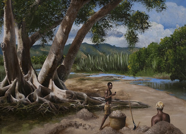 I gave this work a title before I actually knew what irony is. Irony is saying one thing to mean just the opposite. So having a third world laborer checking his cell phone is not an irony, its curious. There is an irony in the painting however; and it has to do with the huge ficus tree standing defiantly in a country that has almost destroyed all of its forests.