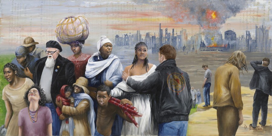 Revelation 18 describes the fall of Babylon, the great city. In verse 4 a voice is heard from heaven, saying: "Get out, my people, as fast as you can, so you don't get mixed up in her sins, so you don't get caught in her doom." (MSG). The question the painting addresses is: Who are My People? What does getting out look like?