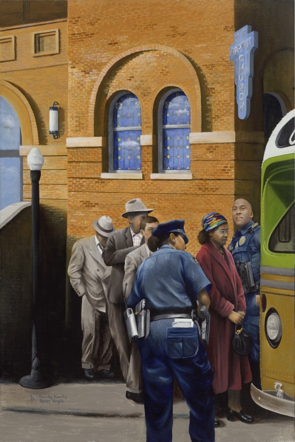 The painting shows Rosa, waiting to board her fateful bus. She thinks she is alone. She keeps eyes down, avoiding eye contact that might be interpreted as defiance. She can’t see that she has angels on either side of her, both police officers of color, with her from the next century. The white men standing behind her may be somewhat aware that she is protected. They are behaving themselves. They may even realize that as of that day, their time is over. The psalmist says that the wicked will vanish; vanish like smoke (Psalm 37:20). One day you have the illusion of control, the next day you are gone. Once Rosa boarded that bus, everything changed.