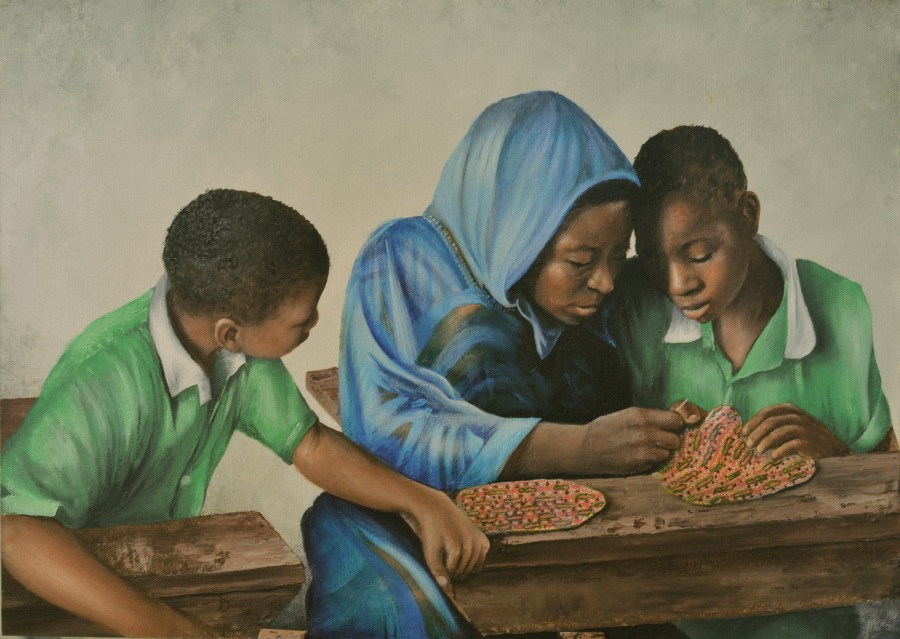 The Sewing Lesson. Oil on linen/ACP. 14 x 19 3/4 inches unframed, 18 1/2 by 24 inches framed,