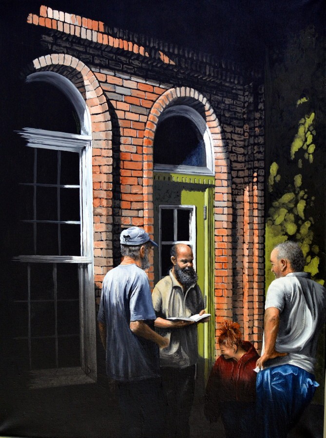 The scene depicts one of the impromptu Bible discussions that break out amongst our friends whenever and wherever. They can get passionate--this Jesus stuff is real to them. And they almost always display a level of Bible knowledge that would put the average church-goer to shame.